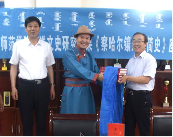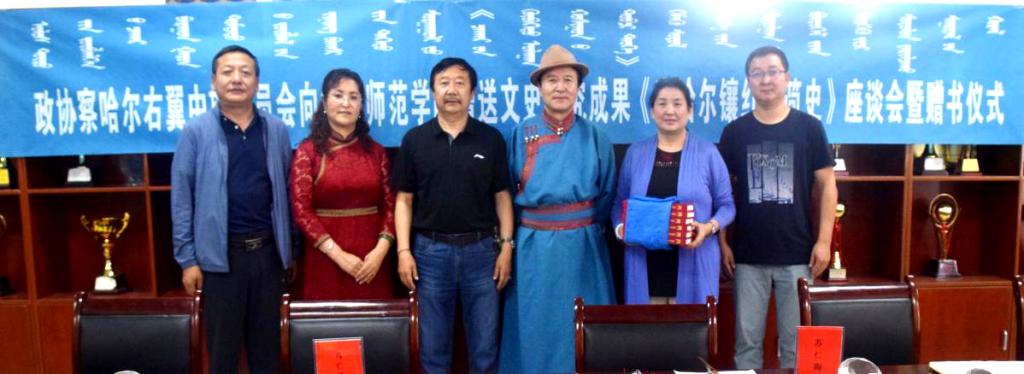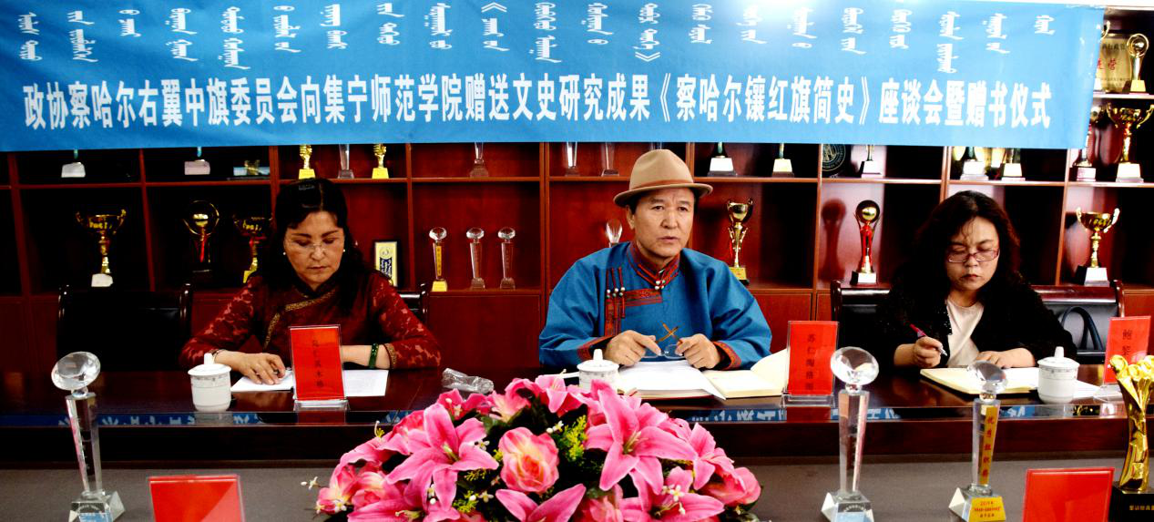 6月29日,政协察右中旗委员向beat365正版唯一官方网站赠送文史研究成果《察哈尔镶红旗简史》座谈会暨赠书仪式在蒙古学学院会议室举行。