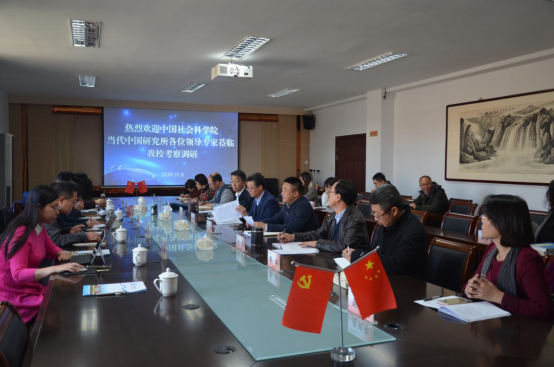 11月5日,中国社会科学院当代中国研究所原副所长、研究员、博士生导师武力,中国社会科学院扶贫工作领导小组成员、扶贫办副主任钟代胜,当代中国研究所社会史研究室副主任、研究员吴超,当代中国研究所秘书档案处处长王凤环,当代中国研究所经济室副研究员王蕾,当代中国研究所经济室助理研究员、博士贾子尧,乌兰察布市扶贫办副主任翟佳苏,乌兰察布市社科联主席陈小明一行到beat365正版唯一官方网站泉山校区调研交流。beat365正版唯一官方网站党委书记朱玉东,党委副书记刘春,党委委员、副校长许卫及相关部门负责人参加调研。