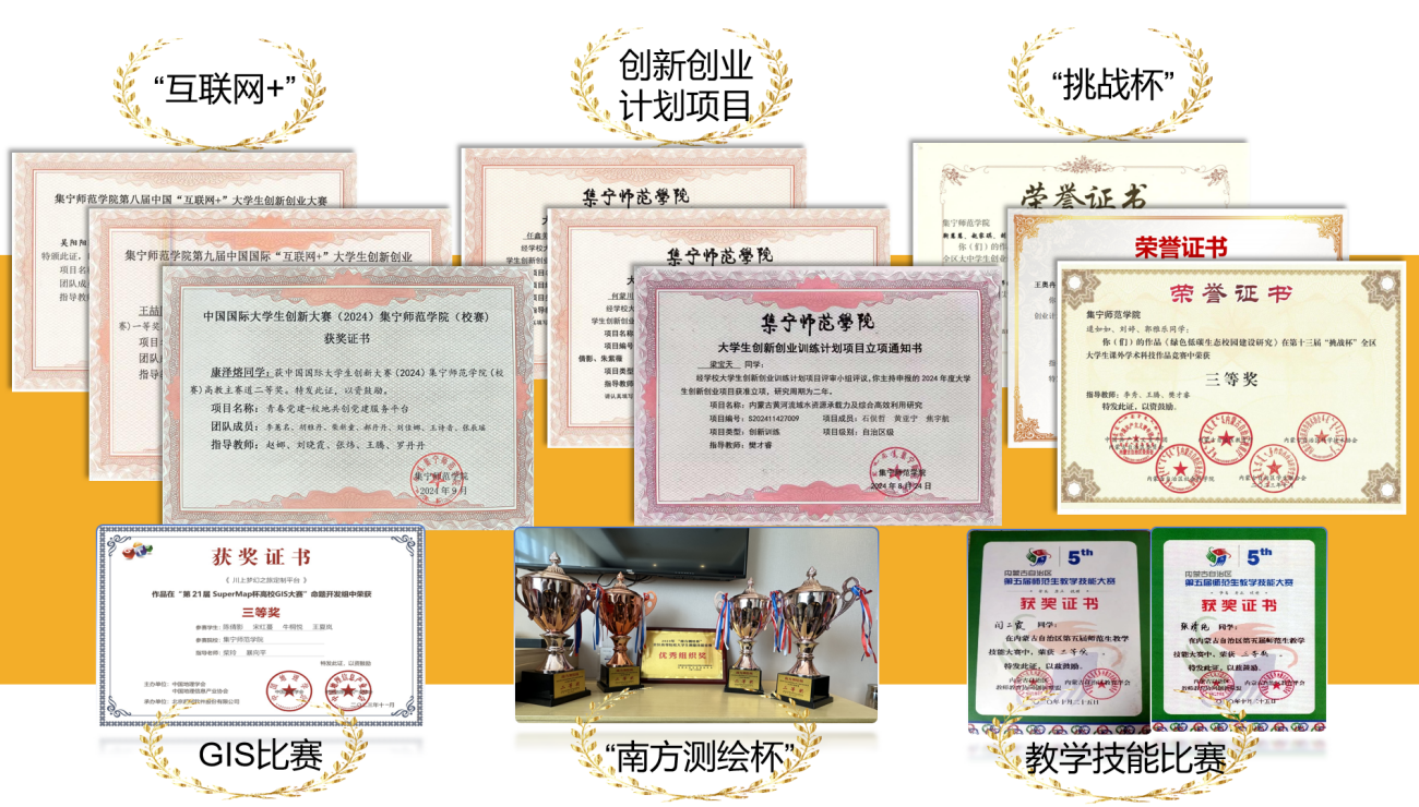 聚焦习近平总书记交给内蒙古的五大任务和全方位建设“模范自治区”两件大事,以科研成果积极服务地方经济社会建设。实验室建设方面,拥有乌兰察布市地理空间大数据应用与环境监测重点实验室,配备570余台设备,总价值460万余元,支撑遥感技术、生态监测等实践教学。近五年教师发表论文114篇,其中核心期刊论文15篇,SCI论文2篇,实用新型专利13个,计算机软件制作权9个,发明专利2个。出版专著8部,承担科研课题60余项 ,其中省部级项目12项,市厅级项目25项,校级项目29项,研究成果应用于乌兰察布市生态红线划定、湿地修复等项目,推动地理信息技术(GIS)与区域发展的深度融合。