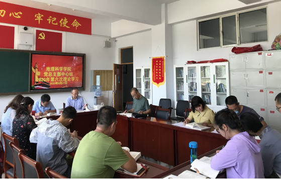 8月27日上午,地理科学学院党总支在主教楼103会议室举行党总支理论学习中心组2020年第六次学习(扩大)会议,会议由党总支副书记张强主持,中心组全体成员参加学习。