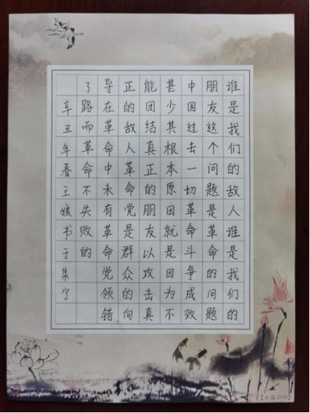 比赛分软笔组、硬笔组、粉笔组三个组别,以爱党爱国的诗词、诗句、文章为主题,将书法内容和书法之美有机结合,尽显师范生爱国情怀。