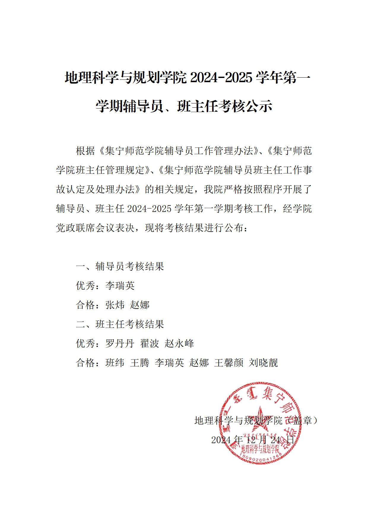 地理科学与规划学院2024-2025学年第一学期辅导员、班主任考核公示