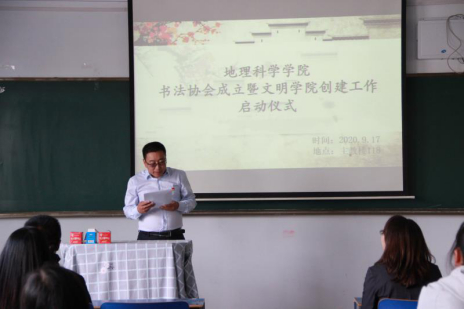 为深入贯彻落实立德树人根本任务、进一步培育和弘扬社会主义核心价值观、推动文明学院建设,9月17日地理科学学院在主教楼举行学院书法协会成立仪式,组织开展审美教育系列活动。beat365正版唯一官方网站党委副书记刘春,党委委员、宣传部部长张富出席活动。