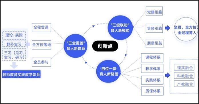 地理科学专业围绕“德育铸魂、智育固本、体育强健、美育浸润、劳育塑人”的“五育并举”理念,创新性构建了“三全覆盖 三级联动 三元融合 四位一体”的人才培养模式(“3334”模式),即坚持“全员、全方位、全过程”三全覆盖,形成“党建引领、导师引路、朋辈引航”三级联动,实现“理实融合、科教融合、产教融合”三元融合,创建“课程体系、教学体系、实践体系、质保体系”四位一体的人才培养体系。该实践经验被推广借鉴,效果良好,赢得了社会各界的广泛赞誉。
