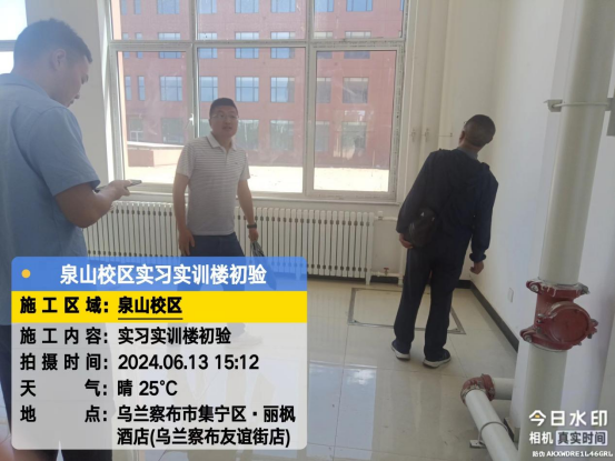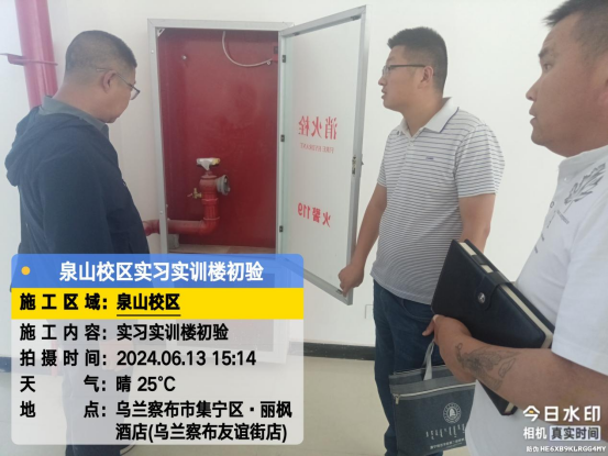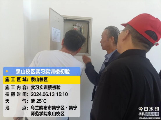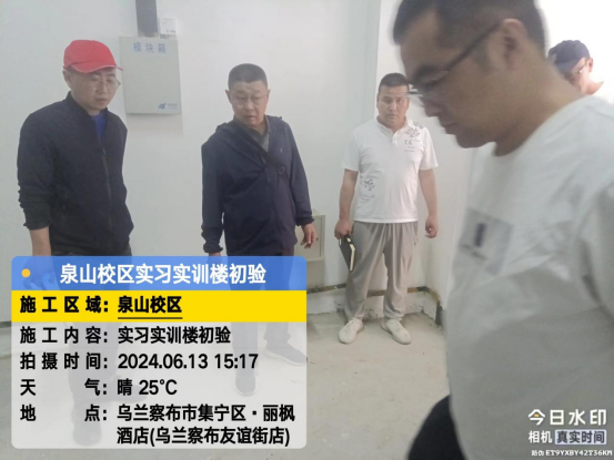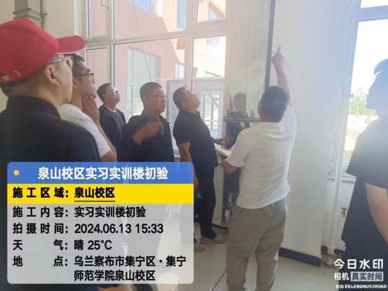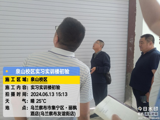 6月13日,后勤基建处副处长李喜安、陈志强一行与施工方初次验收实习实训(楼)工程项目。