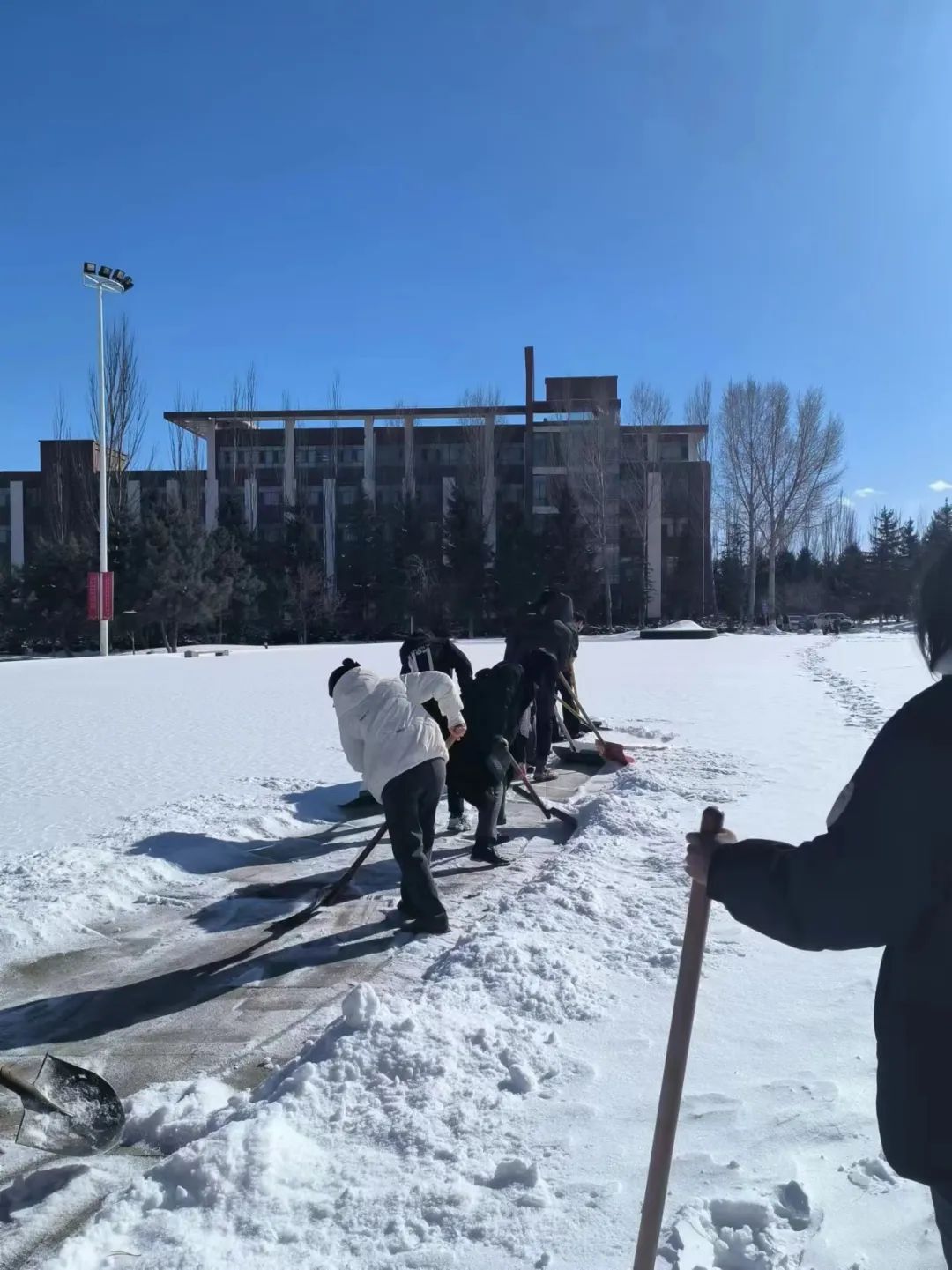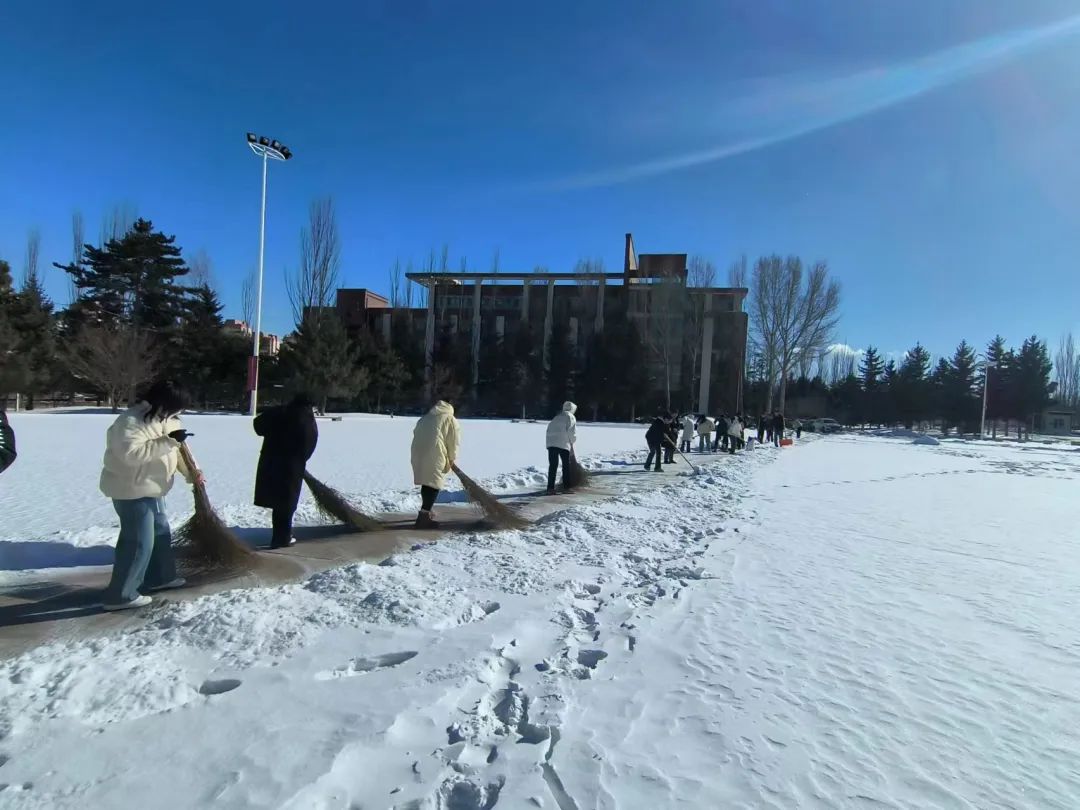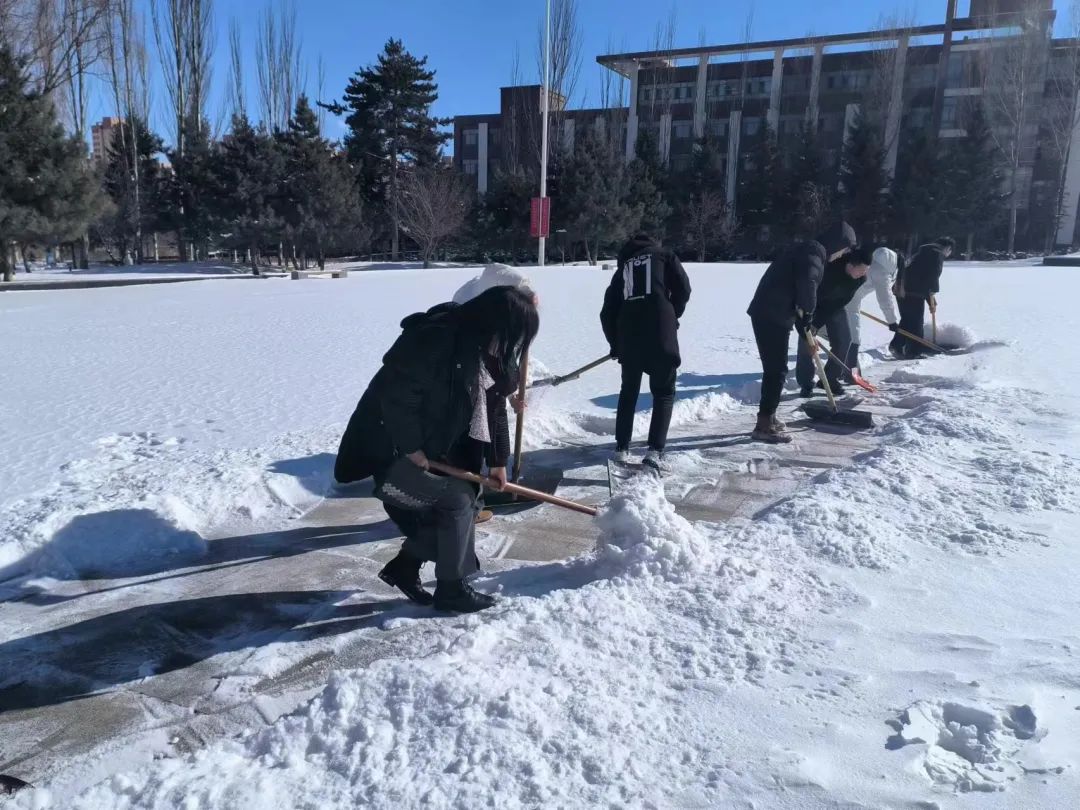 凛冽的寒风中,全体学生支部党员拿着铁锹、除扫铲、扫帚等工具,铲的铲、扫的扫,大家分工有序、配合默契、干劲十足,对逸夫楼前通往主教楼、网教楼以及主教楼通往行政楼的道路积雪进行清扫,一个个忙碌的身影形成了雪天里一道靓丽的风景线,劳动的热情和团结的力量温暖了整个冬日。
