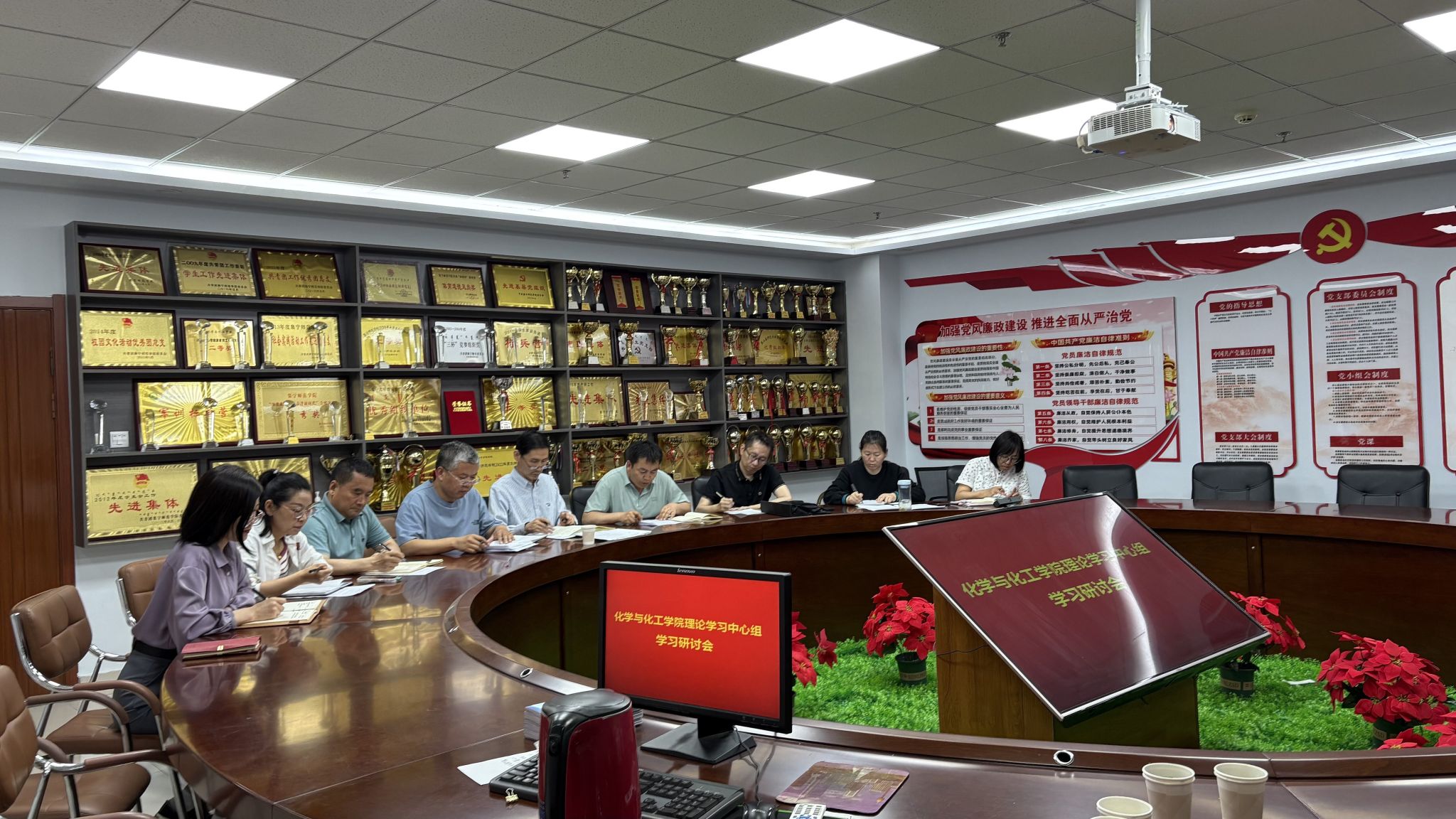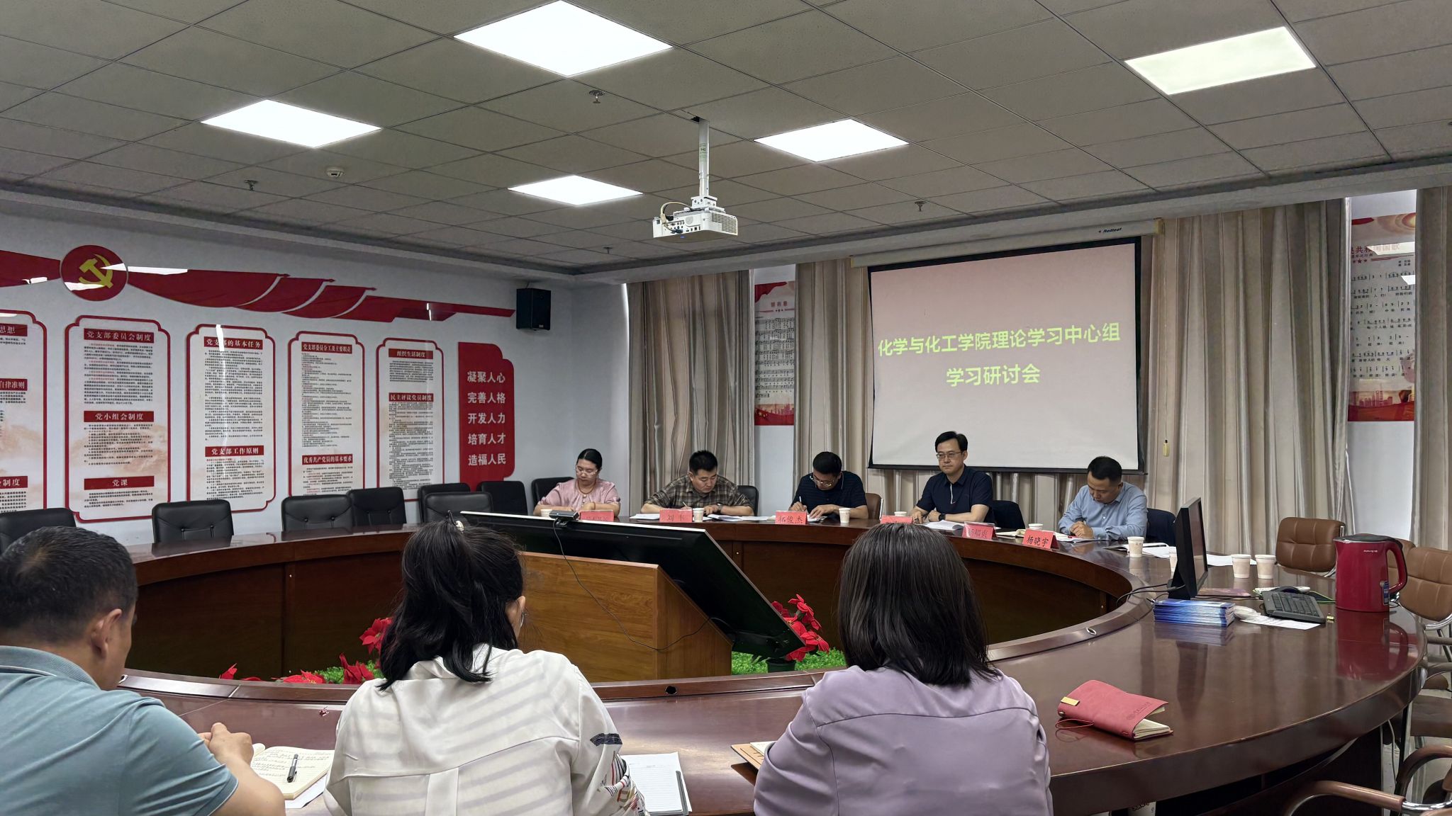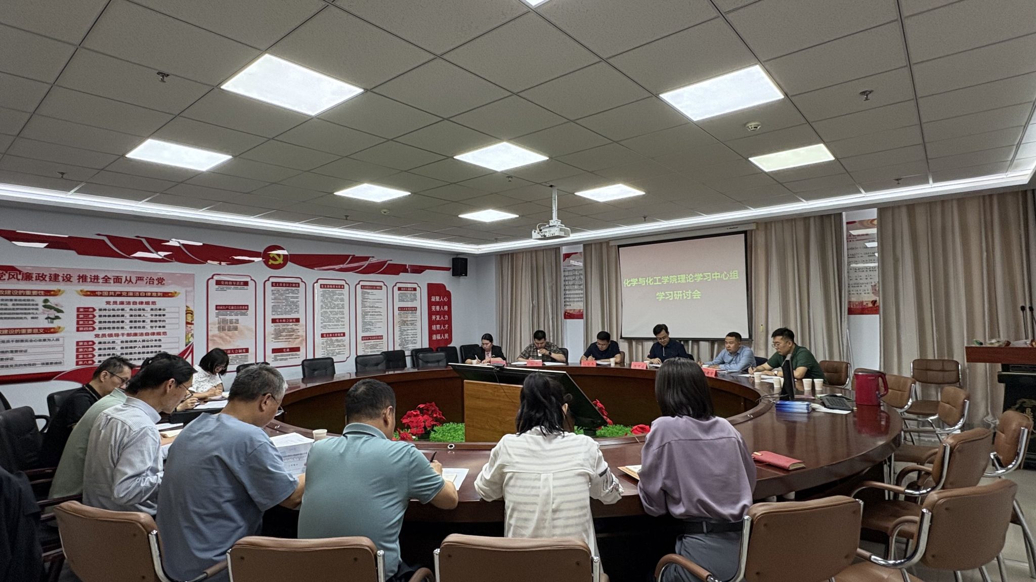 为推动深入贯彻中央八项规定精神学习教育走深走实,根据校党委安排,6月17日下午,校党委书记张宝成,校党委委员、副校长拓俊杰带领组织部、教师工作部等部门负责人深入化学与化工学院巡听旁听理论学习中心组学习研讨并开展调研,学院理论学习中心组全体成员参加会议。