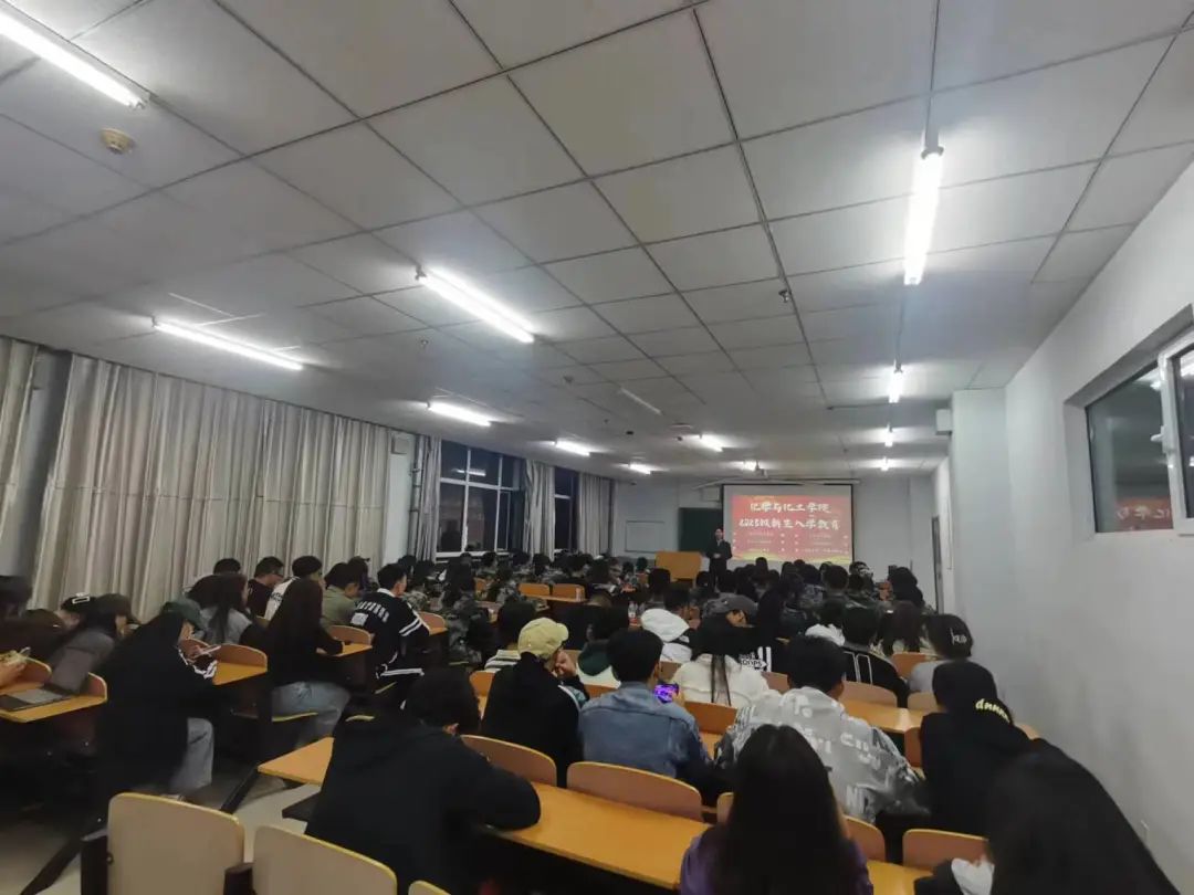 9月13日至14日晚上七点化学与化工学院党总支书记赵有军老师在逸夫楼2Y105与2023级化院全体新生进行入学教育。