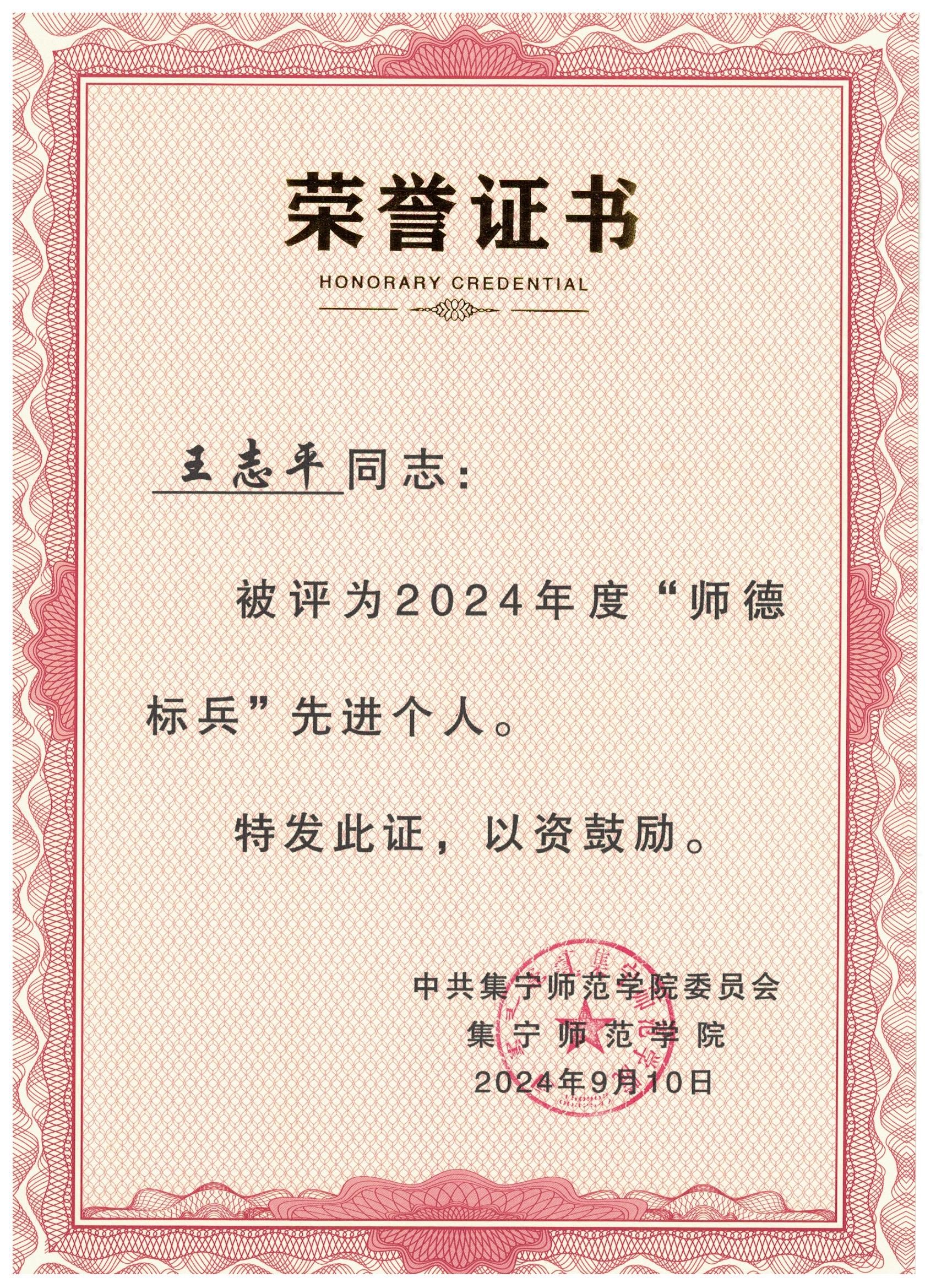 王志平老师在任职以来先后获得多种荣誉:1994年被乌盟行政公署评为“先进教育工作者”;2007年学生军训被评为“优秀带训教师”;2009年承担的《有机化学》课程被评为校级精品课程;2016年被评为beat365正版唯一官方网站“2015年维护稳定暨综合治理工作”先进个人;2017年担任的课程教案被评为学校“2017年优秀教案”、2018年他所在的应用化学专业核心课程团队被学校评为“校级优秀教学团队”、2023年承担的有机化学课程群被评为beat365正版唯一官方网站课程类教学创新团队;2023年指导学生参加第十三届挑战杯全区大学生课外学术科技作品竞赛中获得校级二等奖、区级三等奖。