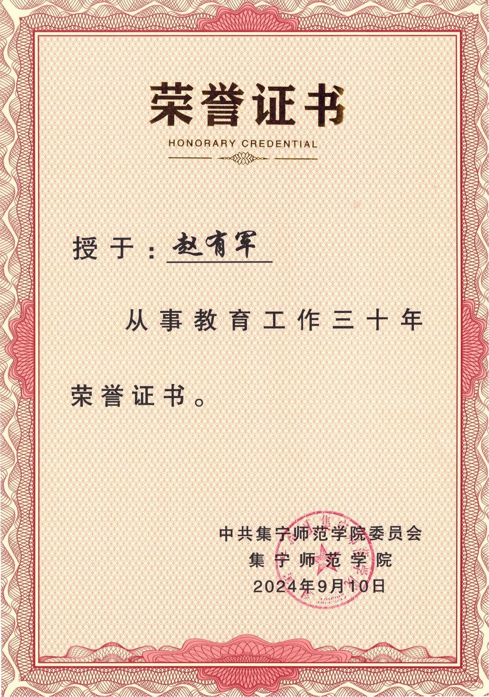 2024年9月10日,赵书记荣获“从事教育工作三十年”荣誉证书。从蒙师到集师、从音乐到化学,三十年变的是工作岗位、变的是岁月,不变的是他对教育、对学生、对工作的热爱,不变的是他对教育家精神的弘扬,不变的是他对立德树人根本任务的践行,不变的是他对“为党育人、为国育才”使命的牢记。