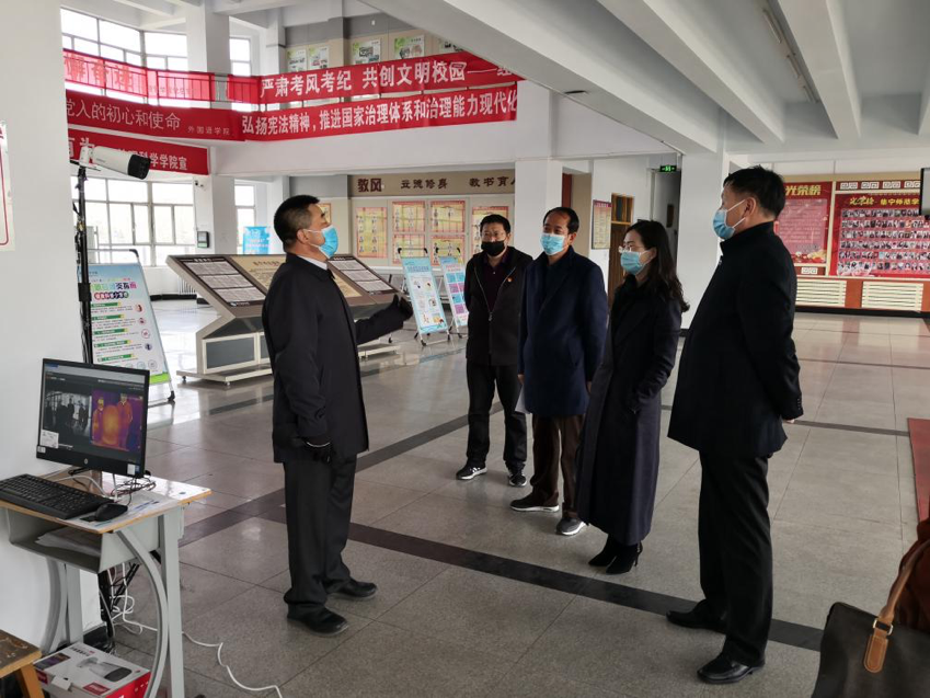 3月31日,乌兰察布职业学院党委委员、副院长周俊霞,党委委员、学生处处长禄全仓,学生处副处长孙爱玲、田晓伟,医务室主任斯琴、副主任张媛媛等一行6人考察beat365正版唯一官方网站疫情防控工作及开学准备情况。beat365正版唯一官方网站党委副书记刘春、党政办主任温世明、学生处处长兰立等陪同考察。