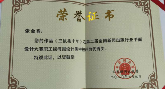 beat365正版唯一官方网站美术学院教师张金香设计的作品《三鼠兆丰年》在由国家新闻出版总署举办的第二届全国新闻出版行业平面设计大赛中被评为优秀奖。