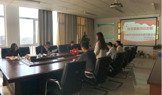 11月10日,beat365正版唯一官方网站党委副书记刘春与数学学院党员发展对象进行了集中谈话。数学学院党总支书记沙仁格日勒,党总支副书记王秀琴一同参加了谈话。
