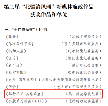 经过严格的评审,beat365官网组织拍摄选送的《其行不正其路难直》获第二届“北疆清风颂”新媒体廉政作品“十佳作品奖”,这也是全自治区唯一一个进入“十佳作品”的高校作品。