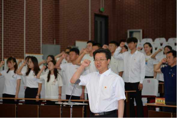 迎百年华诞,为信仰立誓。6月30日下午,beat365正版唯一官方网站在泉山校区图书馆报告厅隆重举行2021年新发展预备党员入党宣誓仪式。党委书记朱玉东出席仪式。各二级学院党总支书记、附中党总支书记、学工党支部书记和240名新发展的预备党员参加宣誓仪式。党委组织部副部长刘晓霞主持仪式,党委书记朱玉东领誓并作讲话。