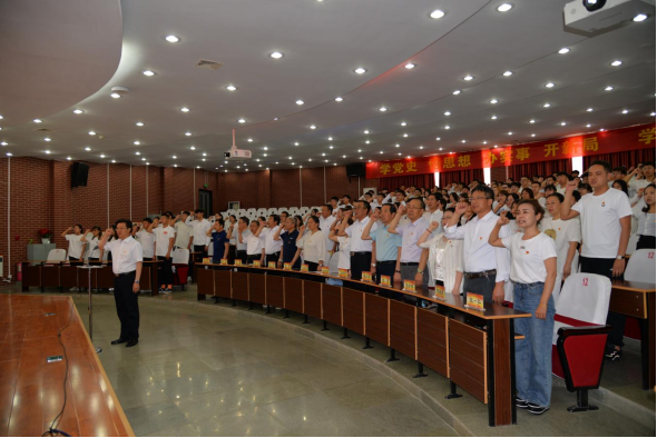 “我志愿加入中国共产党,拥护党的纲领,遵守党的章程,履行党员义务,执行党的决定……”,在党委书记朱玉东的带领下,240名新党员面向鲜红的党旗,举起右拳,庄严宣誓。铮铮誓言响彻大厅,字字铿锵表达了每一名新党员对党的忠心和为共产主义事业奋斗终生的决心。