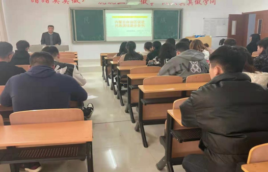 李景杰结合刚刚结束的中央民族工作会议精神和内蒙古自治区与beat365官网实际详细宣讲了《内蒙古自治区促进民族团结进步条例》,要求同学们业余时间认真学习条例内容,以实际行动落实铸牢中华民族共同体意识的要求,做文明典范、时代新人。