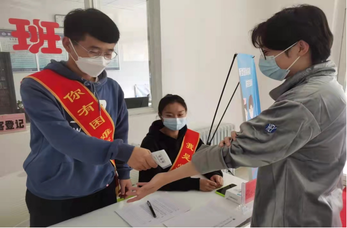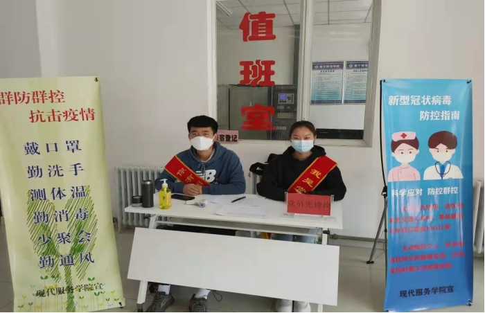 请党放心,防疫有我。学工党支部充分发挥基层战斗堡垒作用,第一时间设立党员先锋岗,学生党员志愿为出入教学楼的同学测量体温、检验行程码,为师生建立起一道安全屏障。