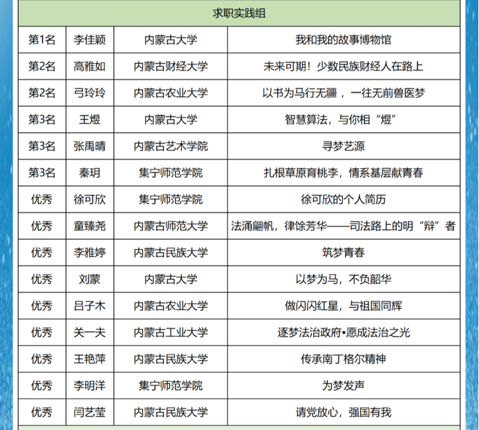 在求职实践组,beat365官网学生秦玥《扎根草原育桃李,情系基层献青春》获第三名,徐可欣《徐可欣的个人简历》获优秀奖、李明洋《为梦发声》获优秀奖。