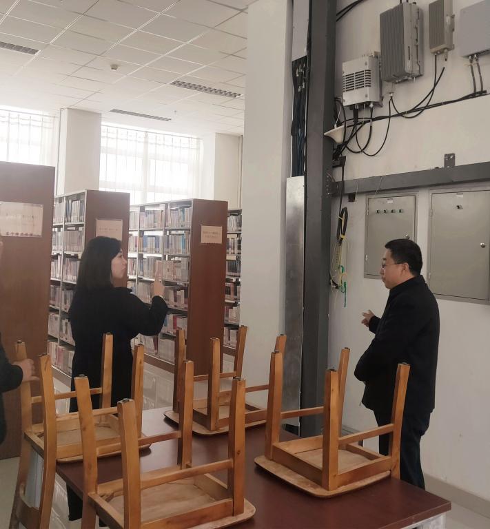 排查期间,后勤基建处针对白海校区图书馆大厅照明、阅览室电源线、网线、照明开关等相关设备损坏情况进行排查。