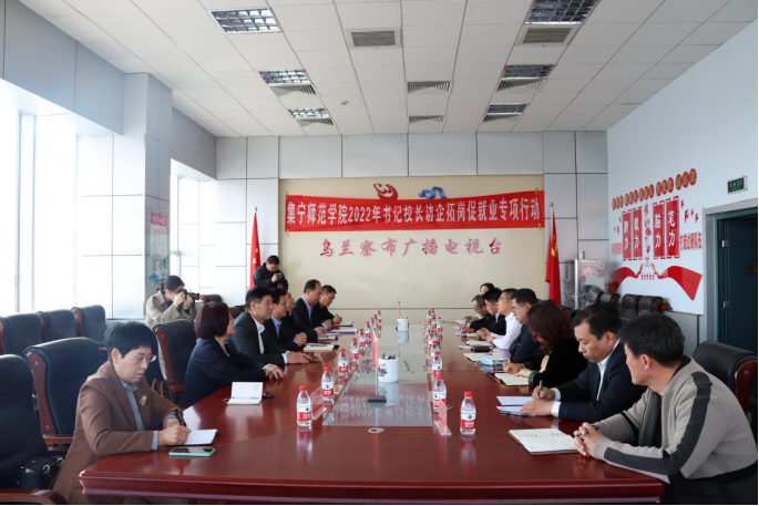乌兰察布市广播电视台党组书记台长王永生、党组成员总编辑张海滨、党组成员副总编辑牧仁及相关部门负责人与朱玉东一行进行座谈。校企双方就毕业生就业创业、课程建设、节目策划等方面达成合作意向。