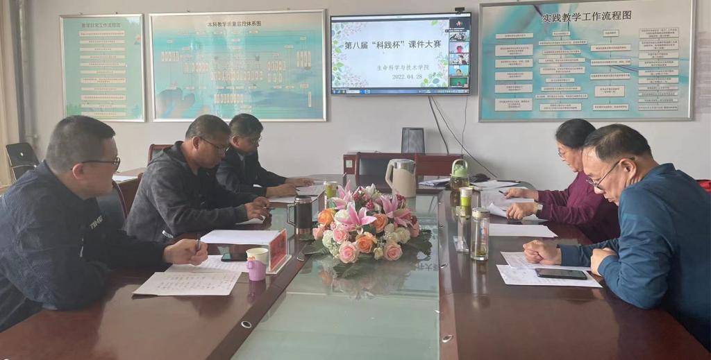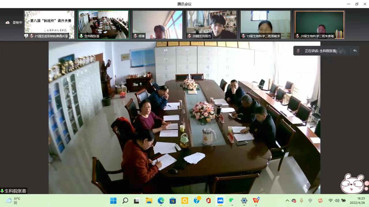 为提高学生课件制作能力,激发学生设计制作多媒体课件兴趣,调动学生在实践教学过程中运用现代教育技术手段的主动性、积极性和创新性,培养高素质、全方位的现代化教育人才,生命科学与技术学院于4月28日在线上举办第八届“科践杯”课件大赛。学院党总支书记夏学利、院长任琴、党总支副书记张军儒、副院长穆俊祥以及指导教师张志鹏担任本次大赛评委,生命科学与技术学院学生会成员观摩比赛。