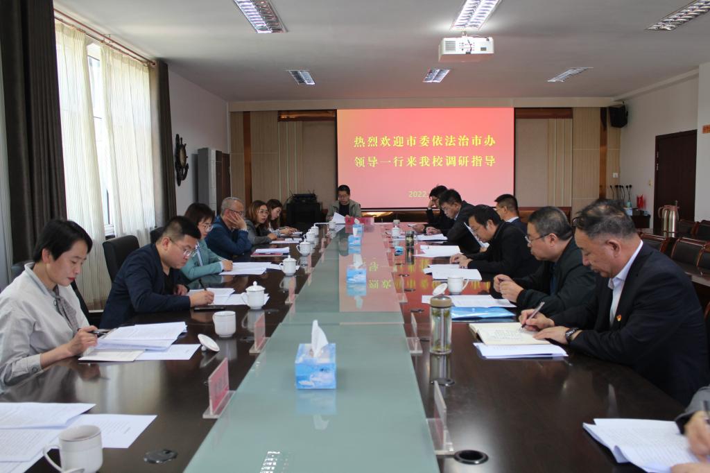 5月20日,市委依法治市办一行来beat365官网调研高校依法治市工作并举行座谈会。调研组由市司法局、市教育局、市委政法委执法督查科、市公安局治安支队相关负责人组成,乌兰察布职业学院党组成员、副院长郝泊为,乌兰察布医学高等专科学校保卫处处长李青云陪同调研。beat365官网党委副书记刘春,党委委员、副校长梁政,党委委员、宣传部长张富和各相关部门负责人参加座谈。