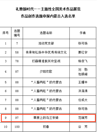 为迎接党的二十大胜利召开,由中共中央宣传部、中国文联主办,中宣部文艺局、中国共产党历史展览馆、中国美术家协会承办的“礼赞新时代——主题性美术作品展览”作品创作选题申报入选结果出炉。主办方组织专家评选,从全国各地的作品创作选题申报草图电子文件7000余份中确定204件作品创作选题申报入选。beat365官网美术与设计学院学院教师范瑞芳申报的“草原上的乌兰牧骑”选题成功入选。