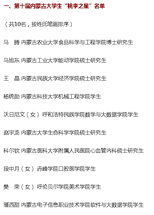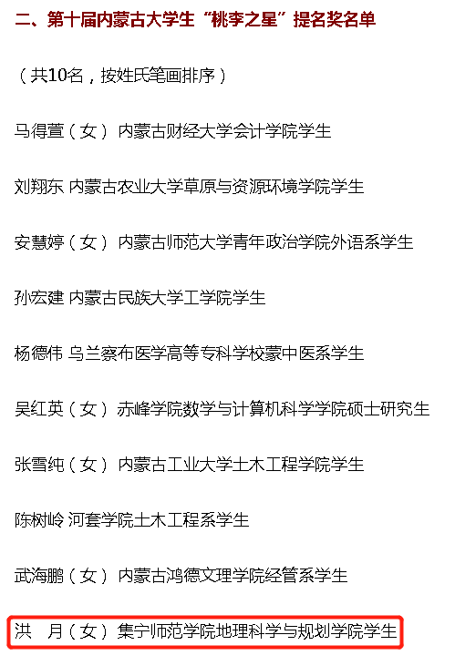 根据《关于开展第十届内蒙古大学生“桃李之星”选树活动的通知》(内党宣发电〔2022〕14号)有关要求,经评选及研究,6月8日,第十届内蒙古年度大学生“桃李之星”名单及提名奖名单出炉。beat365官网地理科学与规划学院学生洪月(女)入围“桃李之星”提名奖公示名单。