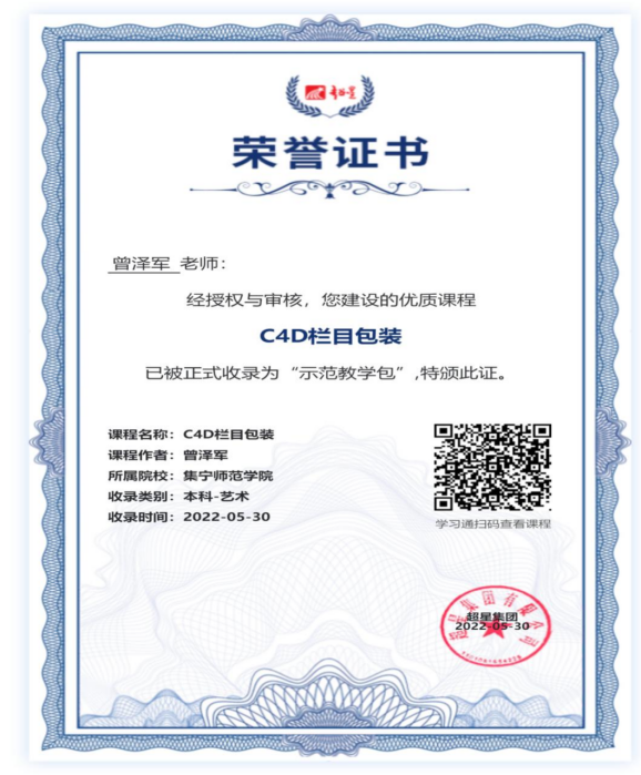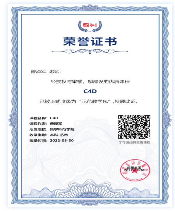 按照beat365正版唯一官方网站教务处统一安排和要求,2021-2022学年第二学期开展线上教学。为保证网络教学质量,我院教师曾泽军按照教学工作安排,讲授《C4D》、《C4D栏目包装》两门课程。依托超星学习通网络平台,完成视频详解2454分钟,直播答疑300分钟,示范操作案列50余例,并完善了课程直播、录播、慕课等教学形式,整合了课堂教学资源,完成了为期十四周,168节课时的网络课程教学。经授权与审核,该两门课程已被正式收录为超星学习通“示范教学包”优质课程,为全国广大教师建课提供了示范支持和帮助,共享给广大师生参考和使用。