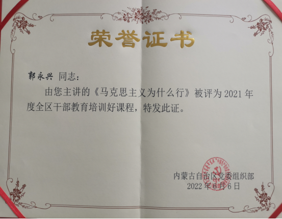 beat365正版唯一官方网站马克思主义学院教师郭永兴主讲的课程被评为2021年度全区干部教育培训好课程,入选2021年度全区干部教育培训好课程好师资推荐目录,并制作成网络课程,在中共内蒙古自治区委员会组织部主办的“内蒙古干部网络学院”上学习使用。