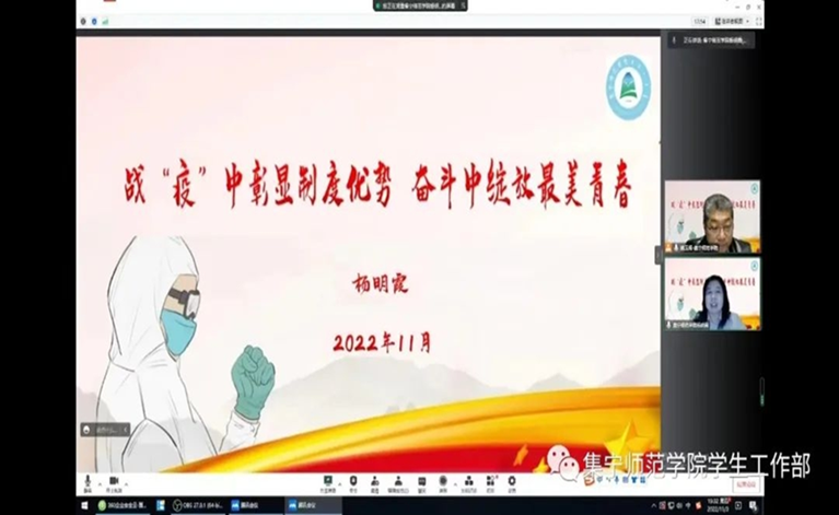 杨明霞结合党的二十大精神,围绕学校新冠病毒疫情防控情况,深度挖掘疫情防控过程中的生动案例,引导大学生传承和弘扬爱国主义精神,深刻认识中国共产党的领导和中国特色社会主义制度的显著优势,深刻认识抗击疫情中的中国速度、中国精神和中国力量,坚定抗击疫情的决心和信心,增强抗击疫情的行动力。勉励新时代大学生以青春之名书写无悔担当,绽放新时代青年最美青春。