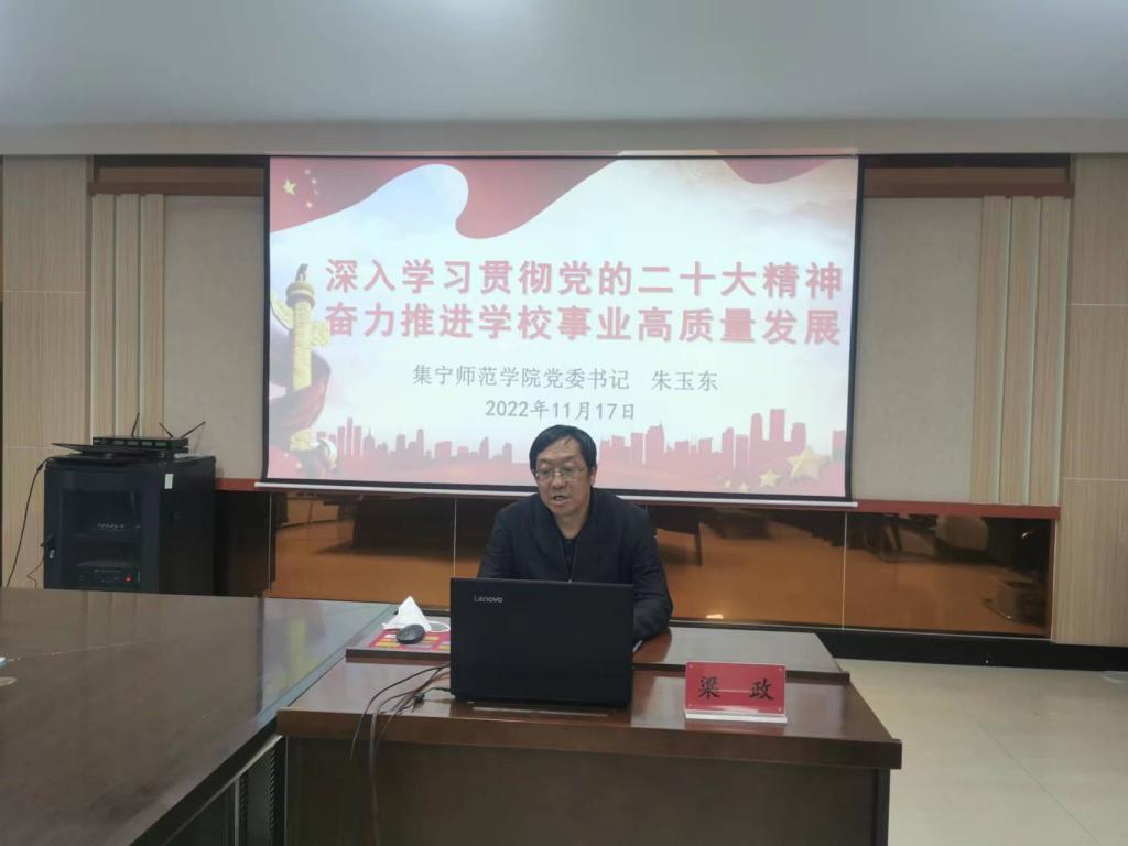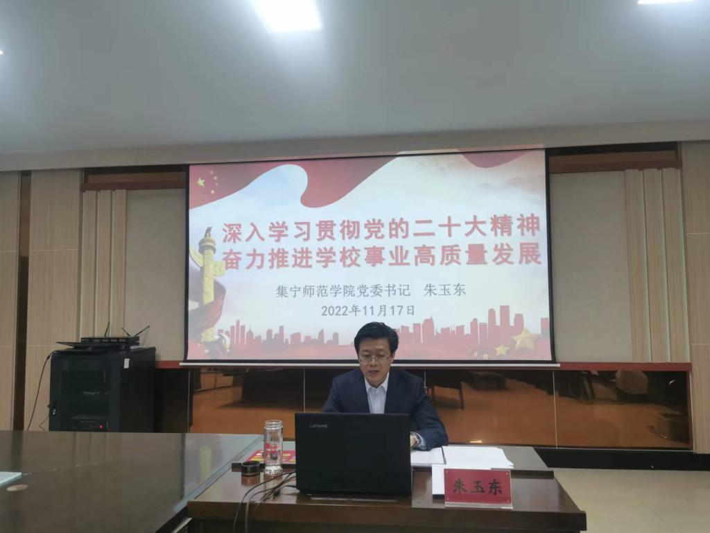 为深入学习宣传贯彻党的二十大精神,根据校党委统一安排,11月17日下午,beat365正版唯一官方网站以线上形式召开党的二十大精神宣讲报告会,校党委书记朱玉东以“深入学习贯彻党的二十大精神 奋力推进学校事业高质量发展”为题作宣讲报告。党委副书记梁政主持报告会,全体校领导、党委委员,全校副处级以上干部,各二级学院师生代表聆听了报告。