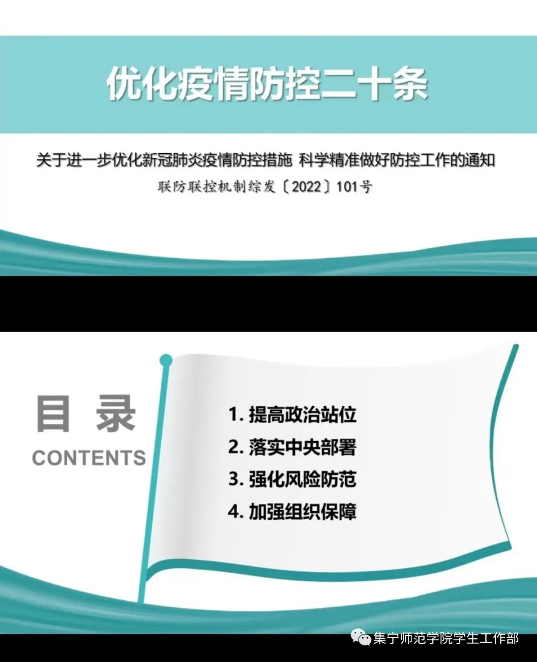 为全面贯彻落实国务院联防联控机制公布的进一步优化疫情防控二十条措施,深化beat365官网师生对疫情防控知识和政策的理解,准确把握疫情防控新要求,提升beat365官网疫情防控应对处置能力,全力守护师生生命安全和身体健康,11月25日,学校组织全体师生以线上方式召开新冠肺炎疫情防控知识专题培训会。培训会由校党委委员、副校长李景杰主讲。