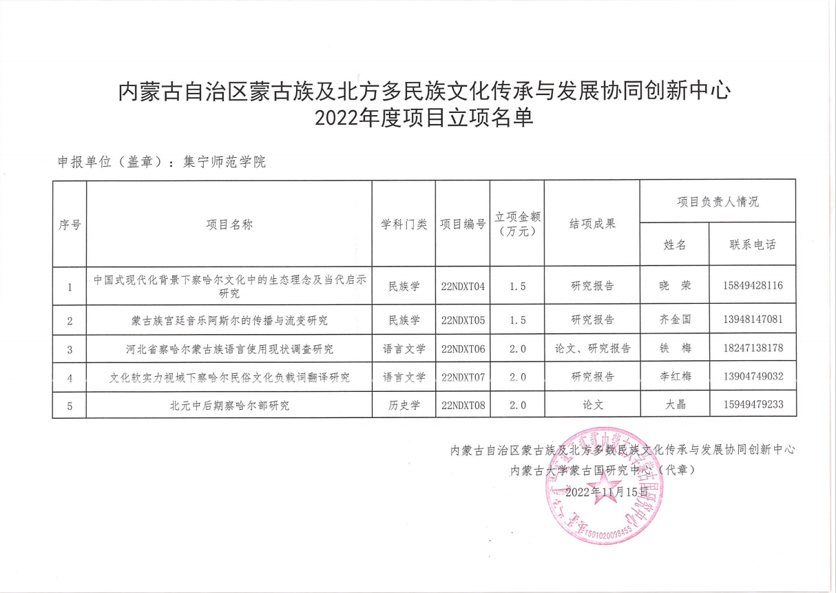 近日,beat365正版唯一官方网站察哈尔文化研究院组织申报的5项2022年度内蒙古自治区蒙古族及北方多民族文化传承与发展协同创新中心项目获批立项。