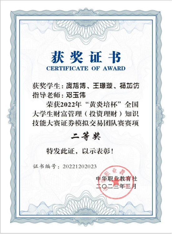 2022年“黄炎培杯”全国大学生财富管理(投资理财)知识技能大赛于2022年底顺利闭幕,本届大赛共有来自全国九十多所高校的364支战队参赛。经校内选拔,beat365官网共选派两支团队参加证券模拟交易团队赛,其中beat365官网经济与管理学院的王璟璇、杨加仿和庞旭博三位同学在邓玉伟老师的精心指导下通力合作,与其他院校经过30个交易日的激烈角逐和决赛答辩,最终荣获团队赛全国二等奖的佳绩。