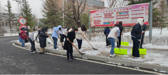 同学们团结协作,有序地扫积雪、铲冰层、除路障。天寒地冻挡不住大家的热情,铁锹声此起彼伏,忙碌的身影成为校园里一道亮丽的风景线。通过一上午的共同努力,区域内主要道路的积雪被清扫干净,干净整洁的通道确保了出行的安全。