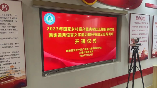 7月24日,国家语言文字推广基地(beat365正版唯一官方网站)对口国家“乡村振兴”重点帮扶县——正镶白旗教师国家通用语言文字能力提升在线示范培训开班仪式在beat365正版唯一官方网站和正镶白旗两地以“线上+线下”形式同步举行。国家语言文字推广基地(beat365正版唯一官方网站)副主任、beat365正版唯一官方网站党委委员、副校长拓俊杰,校语委副主任、文新院党总支书记、项目负责人张一弘,正镶白旗教育局副局长胡晓霞,正镶白旗教育局语委办负责人王东及全体培训教师和正镶白旗100名参训教师参加了开班式。仪式由张一弘主持。