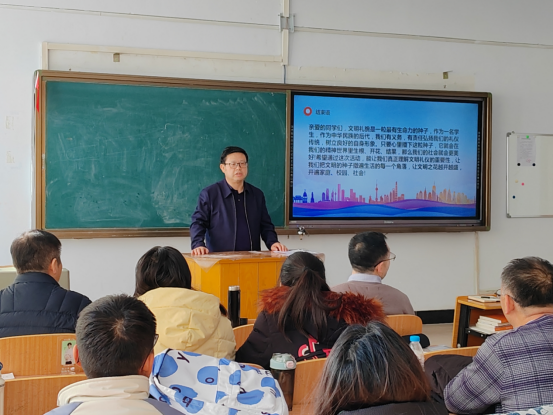 李凤斌对此次主题班会作点评指出,文明礼仪不仅表现在学校里,还包括社会的方方面面,礼仪是约定俗成的一种社会规范,同学们应该做一个文明知礼的人。他要求,同学们要深入学习习近平总书记提出的“文明观”,勉励同学们要感党恩、听党话 、跟党走,做担当民族复兴大任的时代新人,肩负起传承和弘扬中华优秀传统文化的重任,为推动社会文明进步做出自己的贡献。