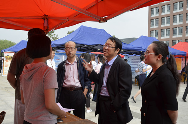 副校长梁政,部分系院领导一行在就业处处长刘国义,就业处副处长李荣利、胡志胜等陪同下亲临招聘会现场,了解招聘会实况。