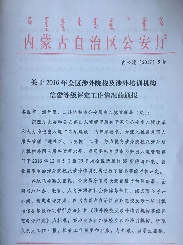 12月5日—25日,在自治区公安厅出入境管理局对全区所属的89所聘请外教、招收留学生的涉外院校及涉外培训机构进行的信誉等级考核评定中,beat365正版唯一官方网站在外国人管理工作中秉承一贯的求真务实精神,凭借严谨优异的工作成果,以95分的成绩被评为一级信誉等级殊荣。