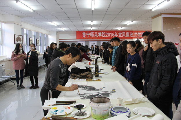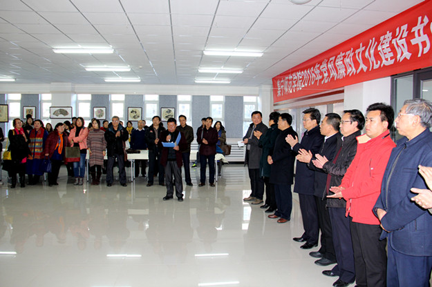 此次活动由校纪委主办,美术系党总支、校工会、校书画协会、校诗词学会协办。出席活动开幕式的校领导有校长朱玉东,党委副书记、纪委书记张利平,党委副书记赵海忠,副校长许卫,党委委员、组织统战部部长朱俊仙。特邀嘉宾有市文化局副局长、市美协主席王永鑫,市书协副主席曹彪,中国美术家协会会员、市书画院副院长郑通贵,内蒙古书法家协会副主席、市书协主席梁能伟。各系(院)主要领导,各党务、行政、教辅部门的主要领导,各党总支纪检委员以及部分教师及学生代表参加了活动。校纪委副书记、监察审计处处长赵向军主持开幕式。