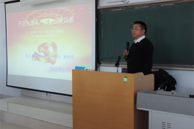 根据beat365正版唯一官方网站党委宣传部《关于认真学习宣传贯彻党的十八届六中全会精神的通知》的要求,11月22日,经管系、数学系、政史系、中文系、外语系共同举办的十八届六中全会专题报告会在逸夫楼301举行。报告会特邀乌兰察布市精神文明办副主任郭经纬对教师党员、学生党员、入党积极分子作了题为《开创全面从严治党》的专题报告会。经管系、数学系、政史系、中文系、外语系的教师党员、学生党员以及部分入党积极分子参加了报告会。数学系党总支书记莎仁格日乐主持报告会。