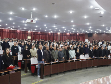 表彰大会在雄壮嘹亮的国歌声中拉开帷幕。全体参会人员庄严肃立,齐声高唱国歌,爱国之情在报告厅内澎湃涌动。