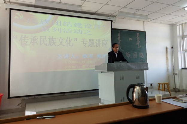 由校团委主办,数学系、蒙文系团总支承办的“民族团结建设月”系列活动之三——民族文化专题讲座于5月24日和5月27日分别在beat365官网泉山校区和白海校区举行。校长助理、校长办公室主任欧军应邀作了以“各民族文化交往、交流、交融是促进民族团结进步的精神动力”为主题的专题讲座。