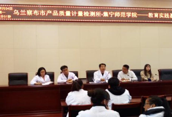 当天下午,“乌兰察布市产品质量计量检测所∙beat365正版唯一官方网站——教育实践基地开班仪式”在质检所会议室举行。副所长俎爱忠、化学系主任李平、质检所景主任、闫主任、班主任田慧英及2014级应用化学专业21名学生参加了开班仪式。开班仪式上,李平首先感谢质量计量检测所为化学系学生提供实习平台,其次向学生提出几点实习要求,希望学生珍惜实习机会,精神饱满的完成实习任务。俎爱忠就所内实验室的基本概况和实习工作注意事项等作了发言。