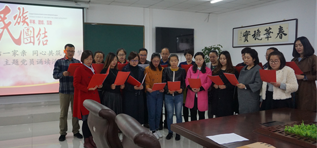 此次主题党日活动以幼师学院党总支开展的“民族团结进步活动月”为契机,围绕“中华民族一家亲 同心共筑中国梦”这一主题,由教师党员代表王富高、闫剑昆、闻雪、范娟、孙俊芳等分别进行激情诵读,最终在全体党员慷慨激昂的齐读声中结束了本次诵读活动。