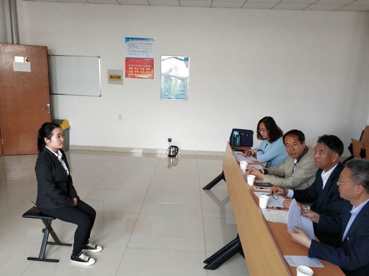 招聘面试于2018年6月1日上午10:00进行。本次招聘面试共有三十二名同学参加,面试的评委由学生工作部学生处、教学督导处、保卫处、白海校区管委会以及国家二级心理咨询师副教授担任。经过面试,招聘石慧等八名同学成为首批白海校区服务大厅勤工俭学工作人员。