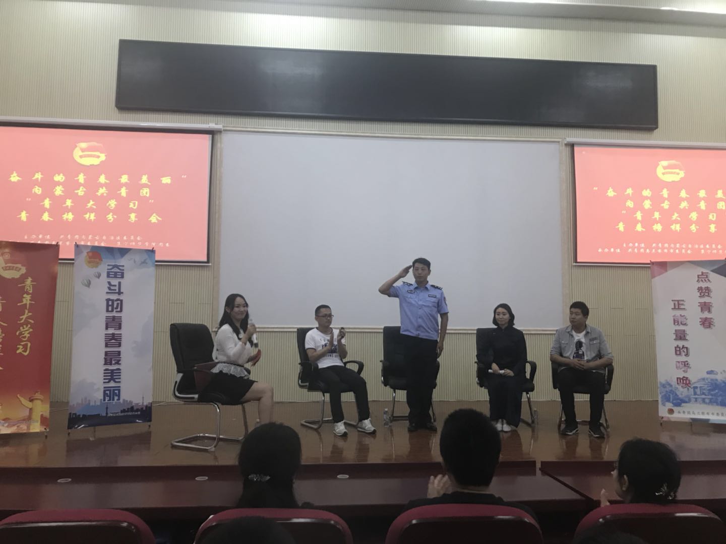 分享会上,青年榜样杜威、连宇、包萨茹拉、付磊等同志分别从尽善尽孝、校园禁毒、奋斗新青年、公益服务等方面进行了分享交流。对师生们的提问一一作答,传递了榜样的精神和力量。青年榜样的奋斗故事催人奋进,激励了在场的每一位观众,大家纷纷表示,要争做先进、踏实学习、努力工作,为“建设亮丽内蒙古·共圆伟大中国梦”贡献自己的青春智慧和力量。
