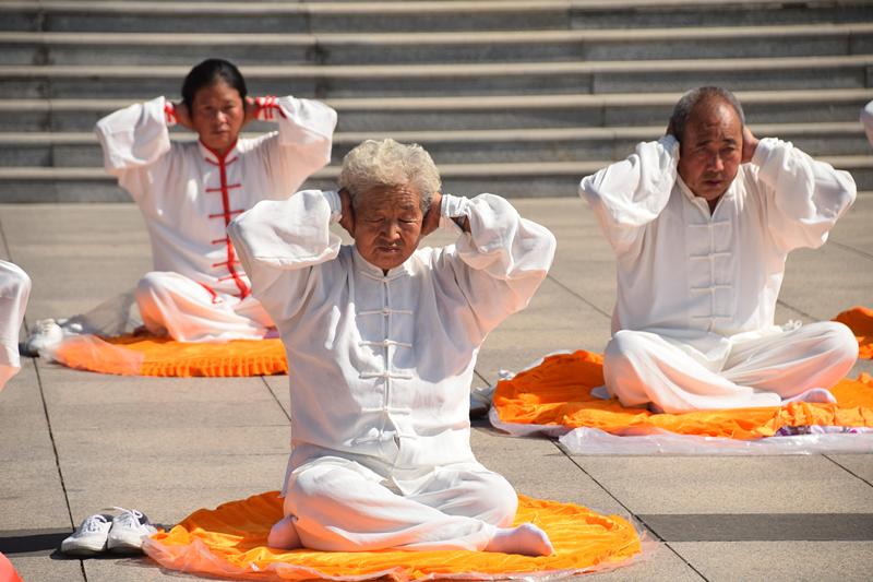 各代表队分别展示了“八段锦”和“太极养生杖”,又分组展示了“十二段锦”、“易筋经”、“大舞”、“五禽戏”等。